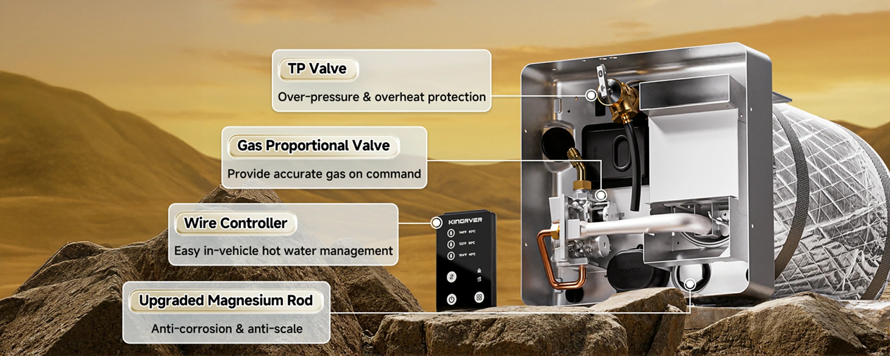 - LEAK-PROTECTING POWERED ROD: This RV water heater features a titanium rod that prevents corrosion and leakage, addressing common issues in tank water heaters. Unlike traditional magnesium anodes, it safeguards the tank against acidic and alkaline water sources. Additionally, it senses the concentration of calcium and magnesium ions in the water, automatically adjusting the release of electrons to continuously optimize water quality.