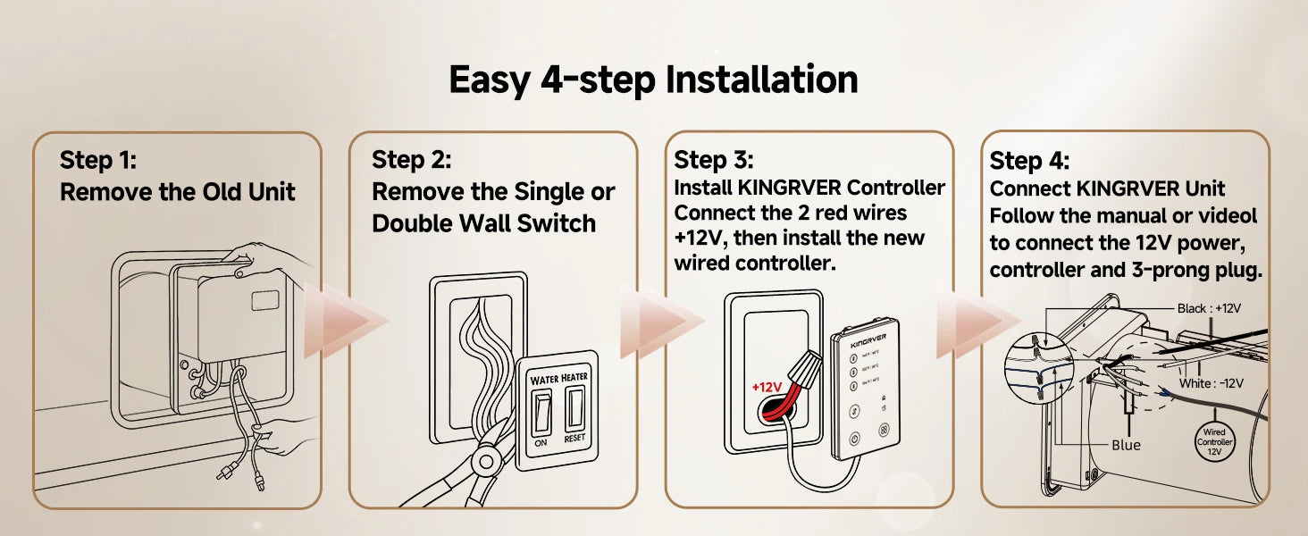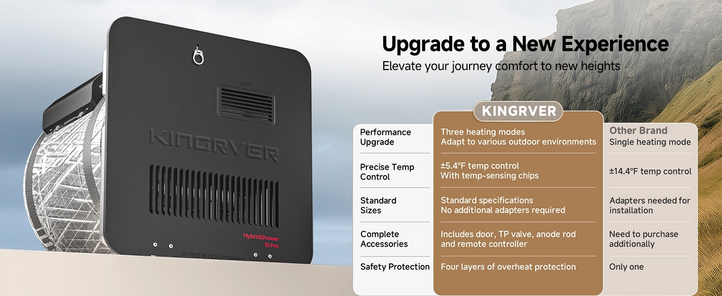 - CUSTOMIZABLE TEMPERATURE CONTROL: Unlike traditional RV water heaters with fixed temperatures, the HybridShower offers three adjustable settings. Choose a lower temperature in summer to avoid burns and the highest setting in winter for a comforting hot shower. The unit also includes multiple safety features, such as dry burn protection, water pressure protection, and overheat protection.