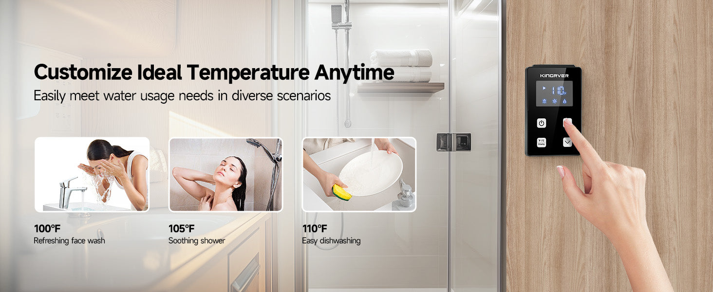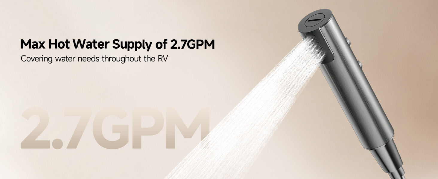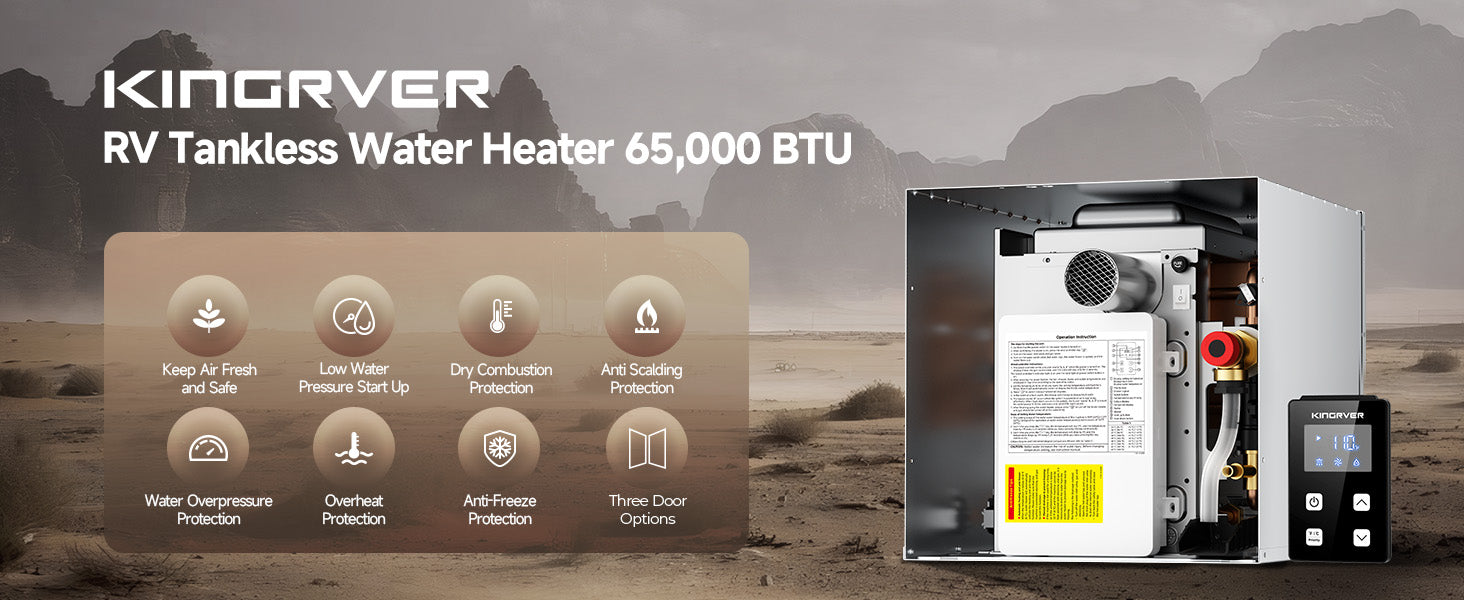 - Endless Hot Water Supply — Our RV water heater packs the most heating power on the market, with a whopping 65,000 BTU heat output. That means endless warm water for your whole RV. The KINGRVER tankless RV water heater effortlessly supports multiple hot showers and dishwashing without preheating. The Adjustable Temperature ranges from 95°F-123°F.