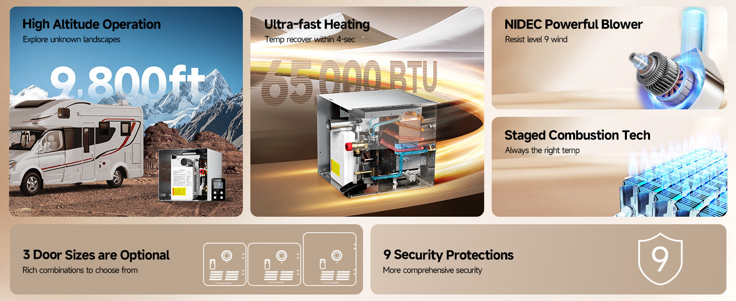 - Built-In Safety: Forced exhaust, 150PSI relief valve, auto gas shut-off, and anti-freeze (activates below 42.8°F).