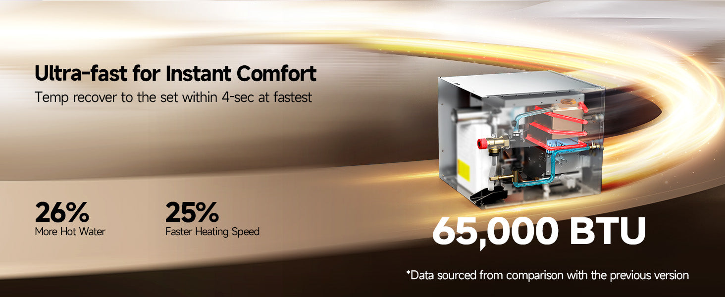 - Endless Hot Water: 65,000 BTU high-power heating for on-demand hot water (95°F–123°F adjustable). Supports multiple showers & dishwashing without preheating.