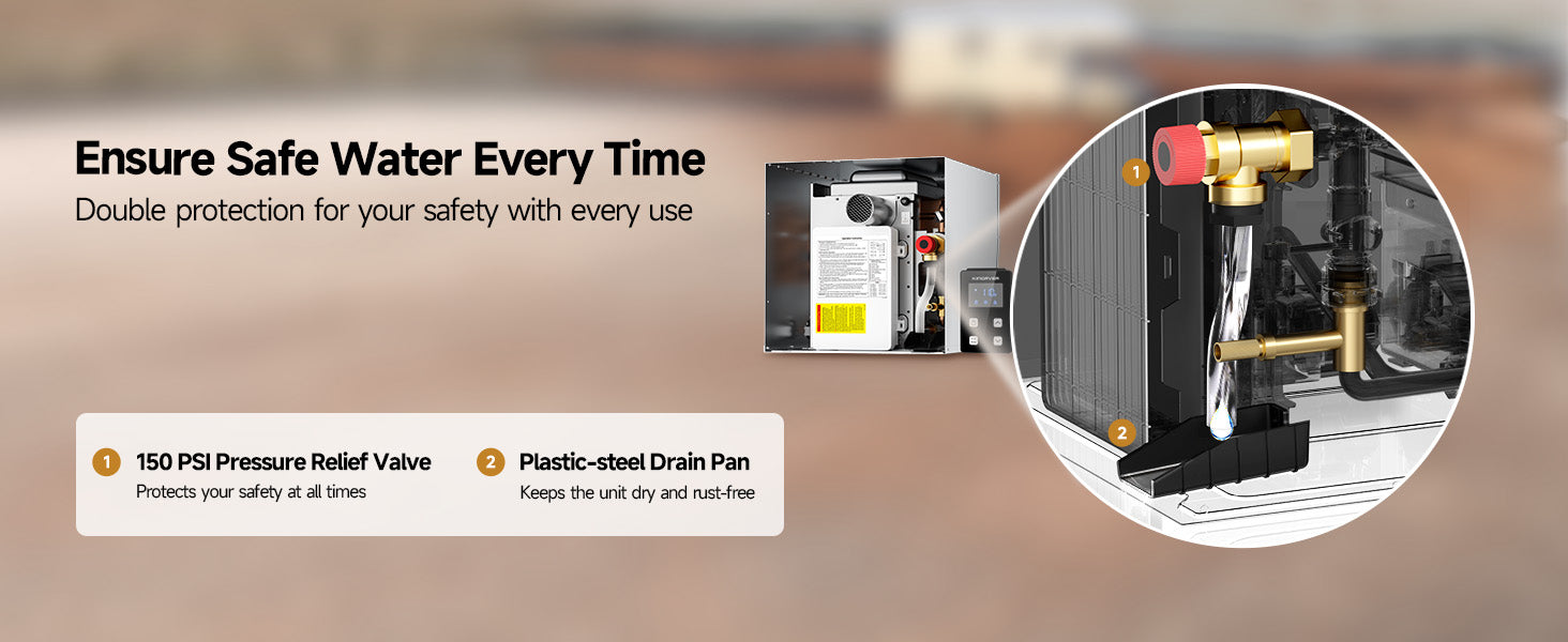 - Built-In Safety Measures — A forced exhaust fan ensures stable combustion. A 150PSI pressure relief valve ensures safety. Plus, automatic gas shut-off protects against accidental flame loss. An anti-freeze device protects against low temperatures that could cause freezing. It automatically activates when sensing below 42.8°F, keeping water thawed. Safety and reliability are built in from the top down.