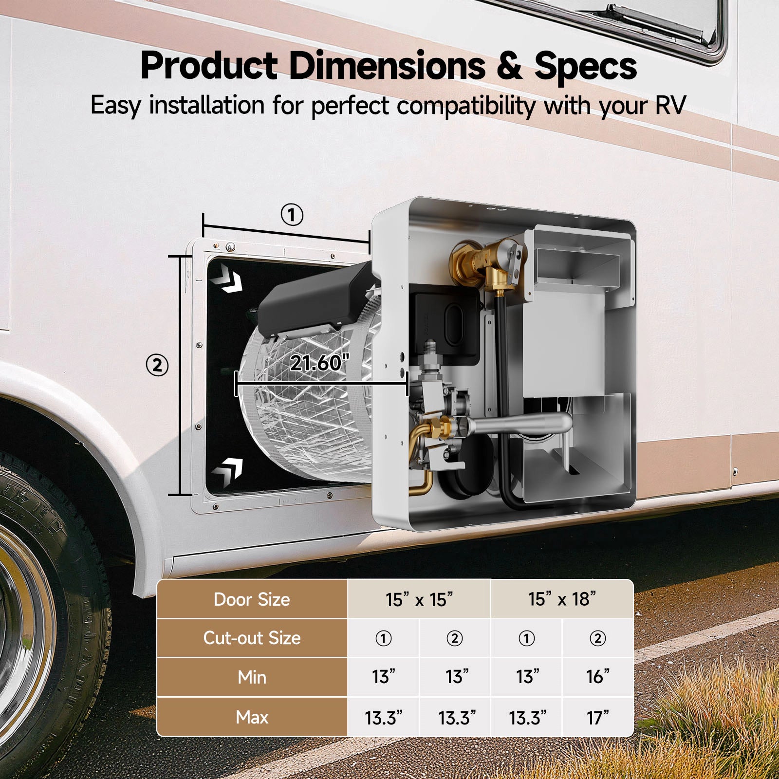 - 𝐖𝐢𝐝𝐞 𝐂𝐨𝐦𝐩𝐚𝐭𝐢𝐛𝐢𝐥𝐢𝐭𝐲: Available with optional 15" x 15" or 15" x 18" doors to match your RV cutout size. Directly replaces most 4–6 gallon Suburban and Dometic water heaters, making upgrades and installations hassle-free.