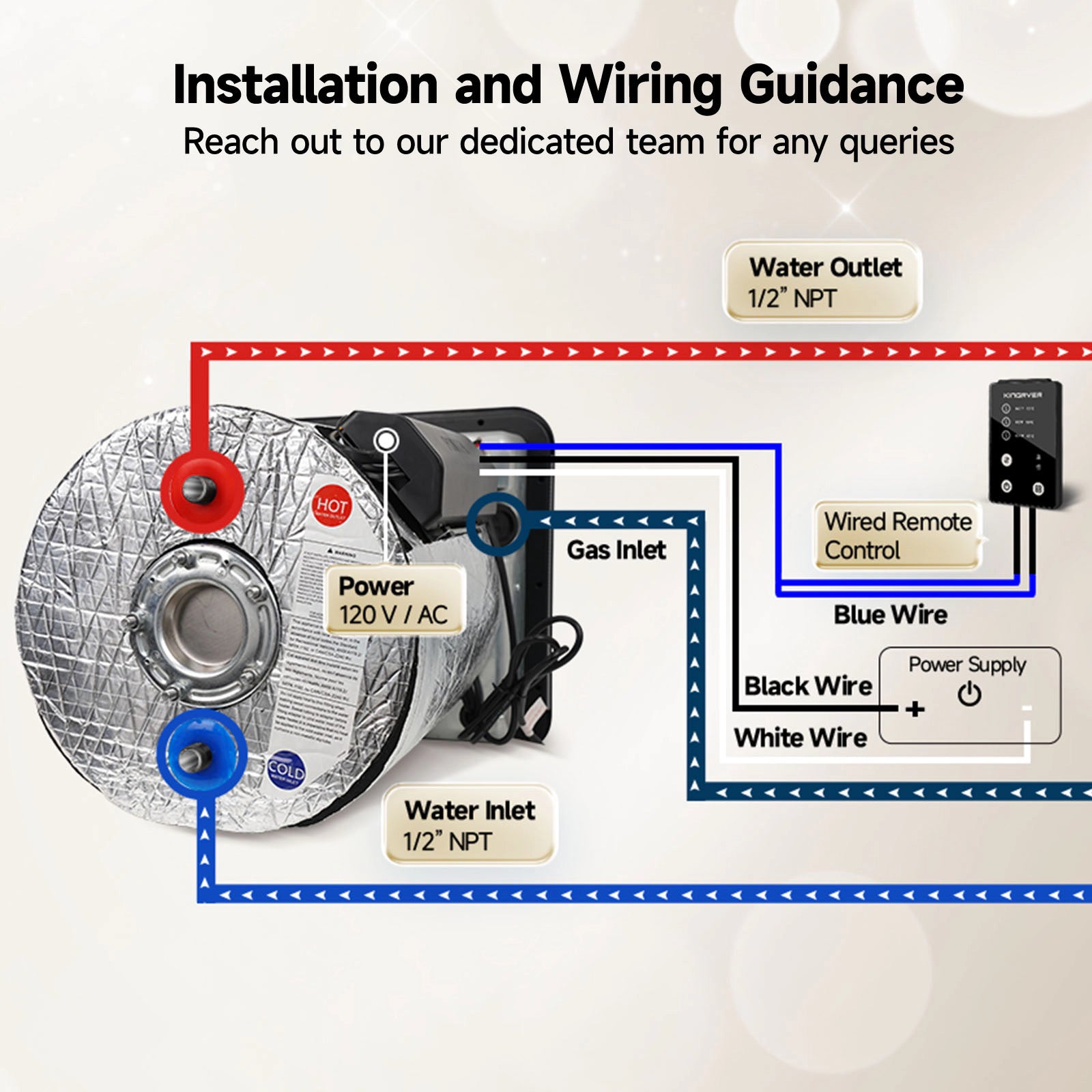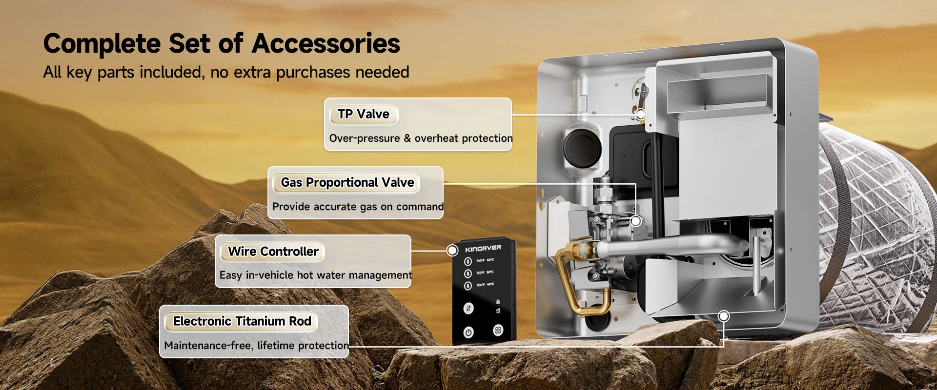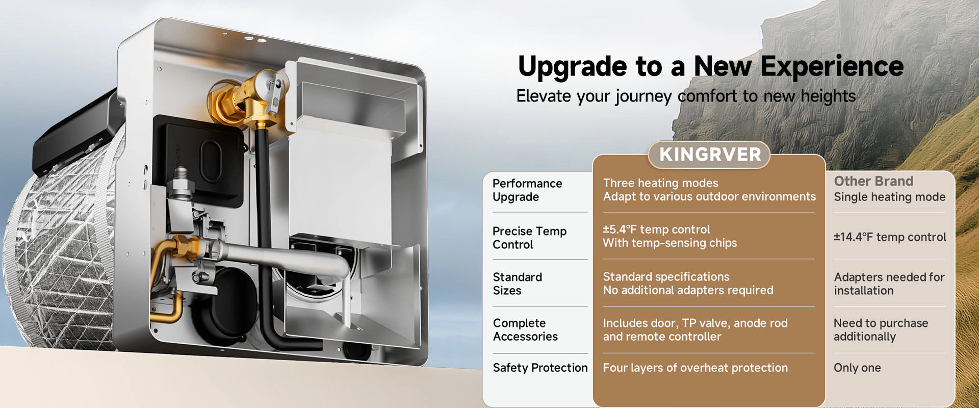 - 𝐃𝐮𝐚𝐥 𝐅𝐮𝐞𝐥 𝐅𝐥𝐞𝐱𝐢𝐛𝐢𝐥𝐢𝐭𝐲: Choose propane, electricity, or both at the same time. Electric mode is safer but require hookups, or relies on propane alone when camping off-grid or boondocking. Run gas and electric together for faster hot water recovery when you need it most